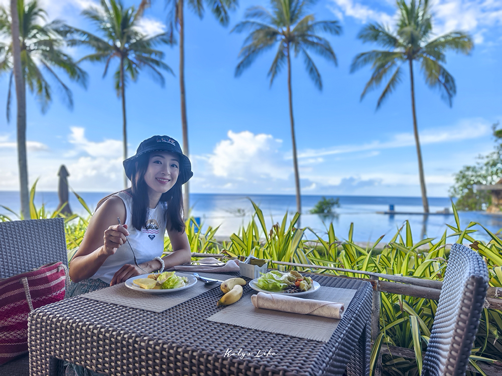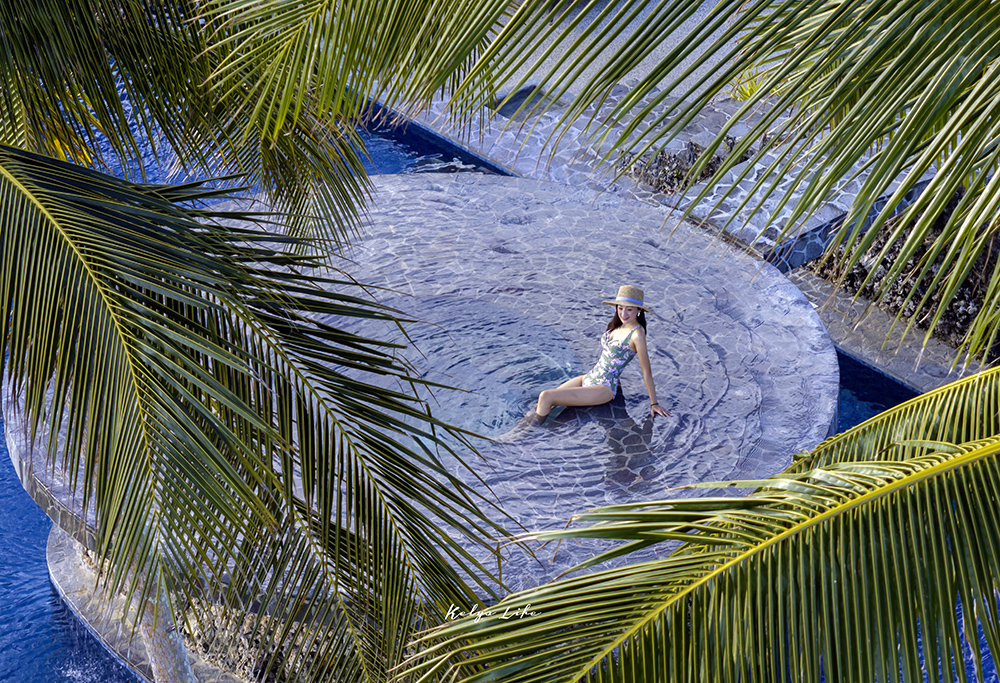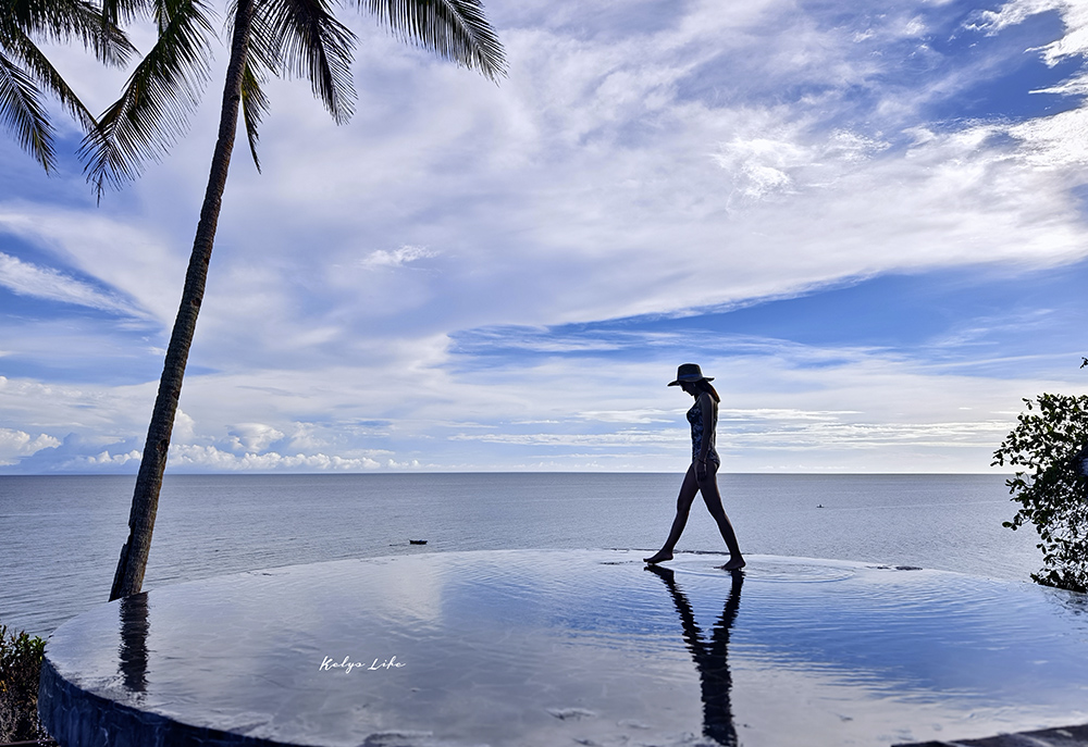 整體來說飯店不算大,但有三座無邊際泳池,分別錯落在不同高度和位置,每一座都能看見不同的風景。我很幸運入住了面海 1 樓的房型,推開落地窗就能直接走到花園與泳池。藍天、海景和椰林在眼前鋪展開來,隨手一拍都像一張雜誌封面照。